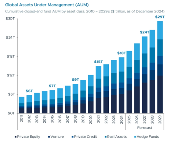 O mercado de alternativos deve continuar crescendo com o passar dos anos. Pelo menos essa é a expectativa da iCapital, que prevê um total de ativos alternativos sobre gestão (AUM) de US$ 29 trilhões até 2029, de acordo com o gráfico abaixo