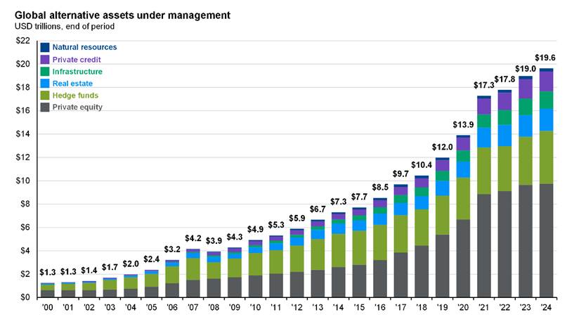 O cenário de fundos alternativos tem crescido muito nos últimos anos. Como é possível ver no gráfico abaixo do J.P. Morgan Asset Management, o mercado saiu de US$ 1,3 trilhão em 2000 para quase US$ 20 trilhões no final de 2024.