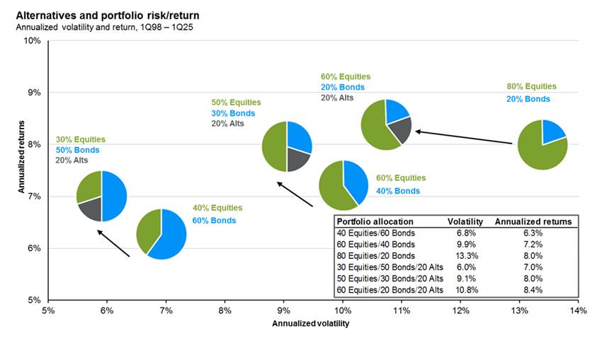 Historicamente nos EUA, uma estratégia muito disseminada é a chamada “60/40 portfolio”, que consiste em 60% em renda variável e 40% em renda fixa. Nos últimos anos, começou-se a adicionar também uma porcentagem de fundos alternativos dentro desse mix. E existe um motivo para isso acontecer: O perfil de risco/retorno melhorou com essa adição, conforme é possível ver no gráfico abaixo do J.P. Morgan Asset Management.