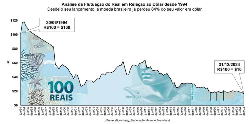 Como ilustra o gráfico abaixo, uma nota de 100 reais comprava 100 dólares em 1994. Ao final de 2024, ela compraria apenas 16 dólares. Ou seja, a desvalorização da nossa moeda chega a ser de 80% frente à moeda americana em apenas 30 anos: