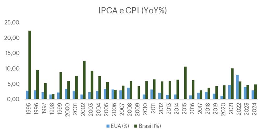 Por sermos um país em desenvolvimento, a nossa inflação é histórica e sistematicamente maior que a inflação dos americanos. No gráfico abaixo temos a comparação do IPCA e do CPI, principais índices de inflação do Brasil e EUA, respectivamente, desde a criação do plano real até 2024. Houve apenas 2 anos em que a inflação americana foi maior que a brasileira: 2006 e 2022, com uma margem bem próxima entre os dois índices.
