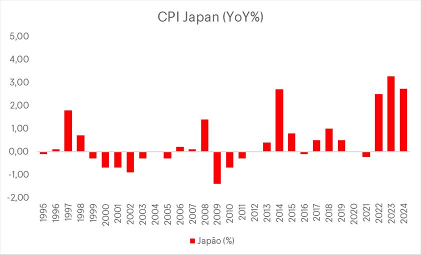 Assim, o Japão passou por um extenso período de deflação. Nos últimos 30 anos, de 1995 até 2024, quase metade dos anos foram de deflação (13 anos), como é possível ver no gráfico abaixo.