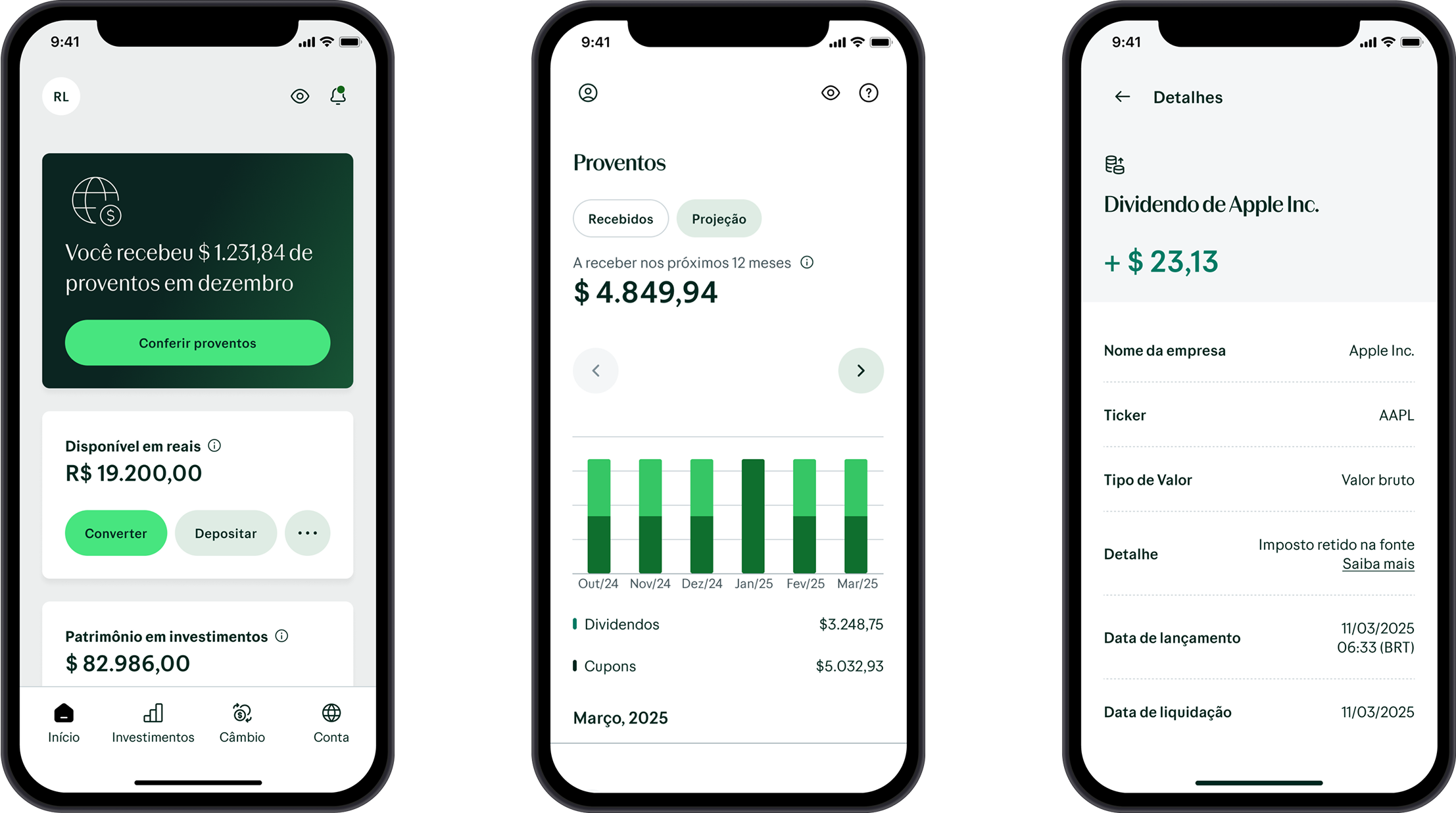 Transparência total sobre os seus ganhos. A nova área de proventos oferece uma visão detalhada dos seus rendimentos: