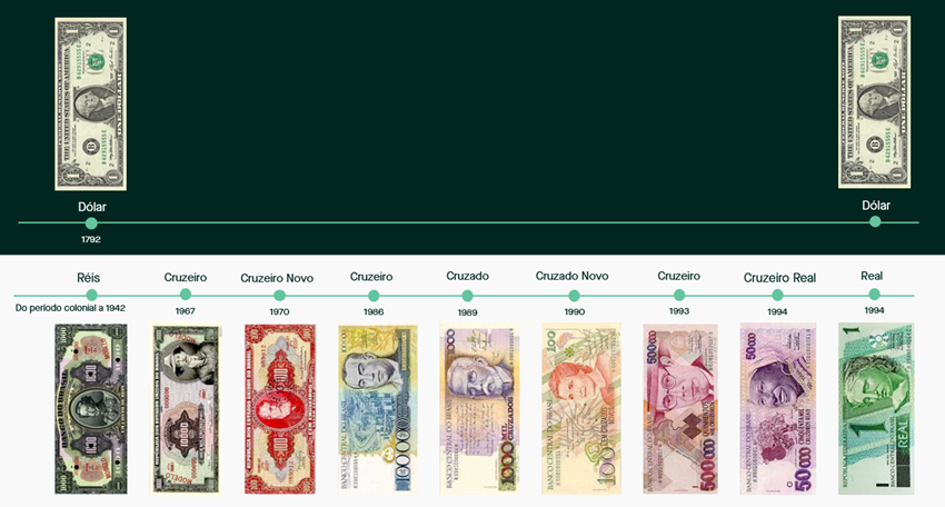 Abrir contaInvestir no Brasil entre as décadas de 60 e 90 foi uma montanha-russa no âmbito monetário. Isso porque houve quase 10 moedas diferentes durante esse período. Em contraponto, o dólar existe desde 1792, com mais de 200 anos sem nenhuma troca monetária. Abaixo é possível ter uma dimensão de diversas moedas brasileiras que existiram, enquanto a americana é a mesma ao longo desses anos. Isso gera também bastante volatilidade cambial e acaba afastando investidores internacionais do mercado local no Brasil.