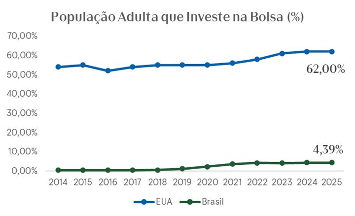 Enquanto mais de 60% da população americana possui uma ação em seu portfólio de investimentos, no Brasil esse número fica um pouco acima dos 4% até setembro de 2025, como é possível visualizar no gráfico abaixo.