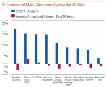 Esse contexto é um dos fatores discutidos em relação aos movimentos do ouro em 2025, quando o metal atingiu patamares historicamente elevados. O gráfico abaixo ilustra a desvalorização do dólar frente a diversas moedas: