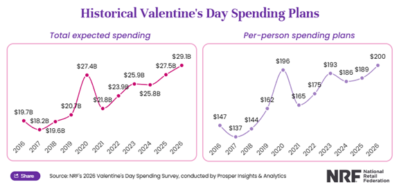 Apesar de ser visto principalmente como uma data romântica, o Valentine’s Day também funciona como um importante indicador do comportamento do consumidor americano e do ritmo da economia no início do ano.