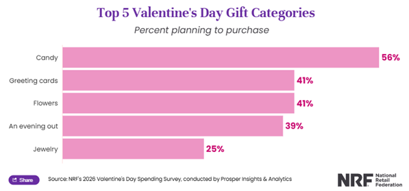 Ainda segundo a pesquisa da NFR, entre os itens de varejo, os doces continuam sendo o presente mais popular do Valentine’s Day, com 56% dos consumidores planejando comprá-los.