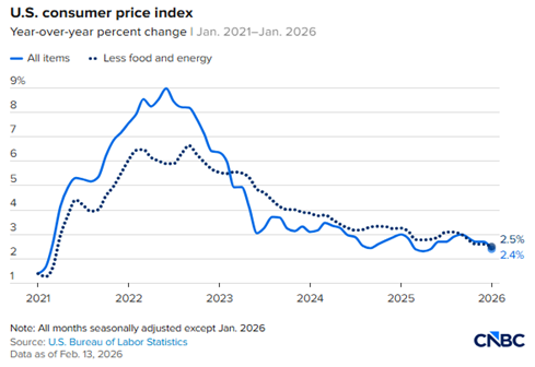 De acordo com o relatório divulgado hoje pelo Bureau of Labor Statistics (BLS), o Índice de Preços ao Consumidor (CPI) dos EUA registrou alta anualizada de 2,4% em janeiro, abaixo das expectativas de 2,5% e marcando o menor nível desde maio de 2025 (queda de 0,3 p.p. em relação aos 2,7% de dezembro). O núcleo do CPI (excluindo alimentos e energia) veio em linha com o esperado, com elevação de 2,5% em 12 meses (ante 2,6% anterior) e 0,3% no mês, exatamente no consenso.