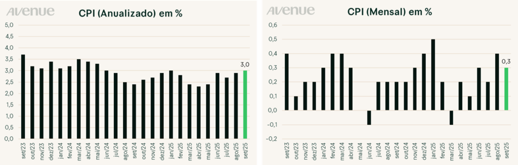 Em setembro de 2025, o Índice de Preços ao Consumidor (CPI) dos Estados Unidos registrou um aumento de 0,3% em relação a agosto, abaixo da expectativa do mercado (que antecipava +0,4%), resultando em uma taxa anualizada de 3,0%, a qual também se mostrou aquém dos 3,1% esperados, conforme dados do Bureau of Labor Statistics. Já o CPI core (núcleo do dado), que exclui os voláteis preços de alimentos e energia, subiu 0,2% no mês de setembro, também abaixo do esperado pelos investidores (que previam +0,3%), configurando variação anual de 3,0% (vs. +3,1% esperados).