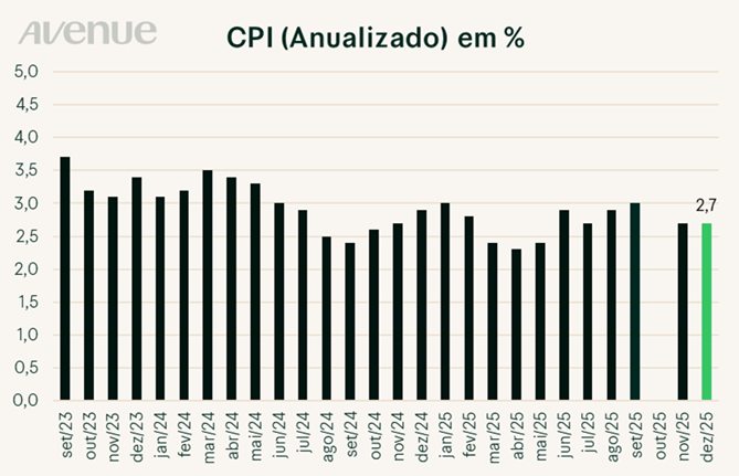 A boa notícia do dado de inflação foi o fato dos preços ao consumidor nos Estados Unidos terem subido menos que o esperado em dezembro quando olhamos o núcleo, reforçando a percepção de que a inflação continua em processo de desaceleração. Por outro lado, podemos dizer que a inflação ainda não deu um “sinal verde” para o Fed cortar juros, uma vez que os dados ainda se encontram significativamente acima da meta do Fed de 2% ao ano. O relatório de dezembro oferece sinais de que o ritmo de alta dos preços está se aproximando dessa meta, embora ainda permaneça acima do desejado. Chama atenção o impacto modesto das tarifas até o momento. Em suma, entendemos que o relatório de hoje não dá ao Fed confiança suficiente para realizar um corte de juros já neste mês. De acordo com a ferramenta CME FedWatch, a probabilidade de um novo corte de juros recai para junho.