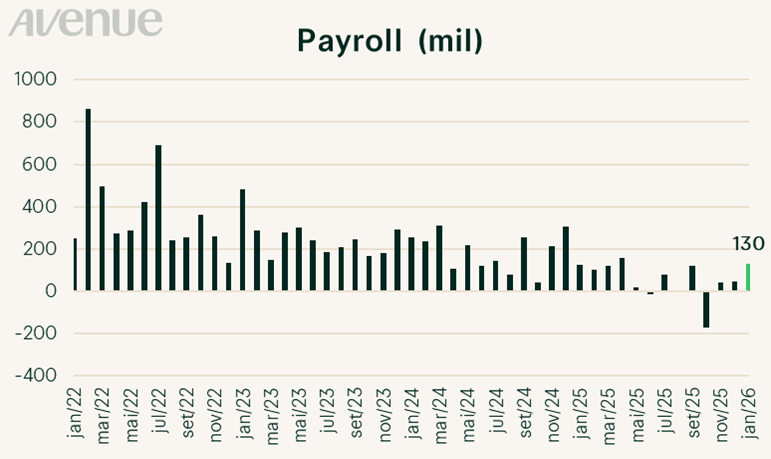 O Departamento de Estatísticas do Trabalho dos EUA (BLS) divulgou hoje, 11 de fevereiro de 2026, o relatório de empregos não agrícolas de janeiro de 2026 que mostrou um crescimento mais forte do que o esperado no mercado de trabalho americano. Houve a criação de 130 mil vagas de emprego, superando significativamente a expectativa consensual do mercado de 55 mil. A taxa de desemprego caiu para 4,3%, abaixo da previsão de permanecer em 4,4%. Além disso, uma medida mais ampla de subutilização da força de trabalho recuou para 8%, com ganhos salariais médios horários de 0,4% no mês (acima do esperado) e 3,7% anual. Esses números representaram o melhor mês desde dezembro de 2024, aliviando preocupações após um 2025 de crescimento médio muito baixo (cerca de 15 mil vagas/mês após as revisões).