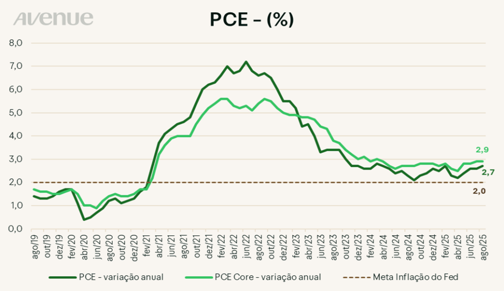 O relatório de sexta-feira (26/setembro/2025) do Departamento de Comércio mostrou que o índice de preços de despesas de consumo pessoal (PCE), a medida de inflação preferida do Federal Reserve, subiu 0,3% em agosto de 2025, resultando em uma taxa de inflação anual de 2,7%, em linha com o esperado de 2,7%. O PCE núcleo, que exclui alimentos e energia, aumentou 0,2% mensalmente e 2,9% anualmente, também em linha com o previsto. Os gastos do consumidor aumentaram 0,6%, crescimento esse superior ao aumento de 0,5% esperado.